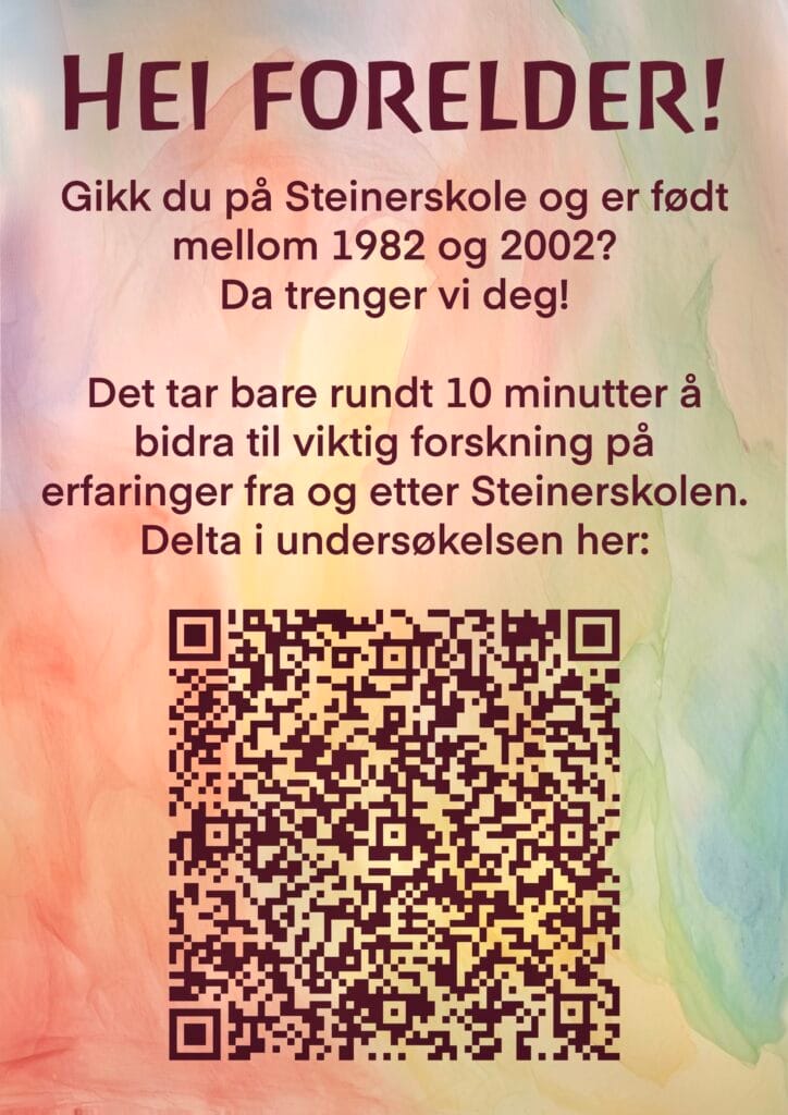Steinerhøyskolen har i samarbeid med de andre nordiske landene utarbeidet en studie som undersøker hvordan det går med tidligere steinerskole-elever. Dette er et veldig viktig arbeid som vil gi oss mye spennende forskning. Vi trenger deres hjelp til å samle inn nok svar for at undersøkelsen skal ha nok legitimitet. Del med alle du kjenner som er født mellom 1982 og 2002 som har gått på steinerskolen, del med foreldre, på julemarkeder og send privat til folk du kjenner. Takk for all hjelp!